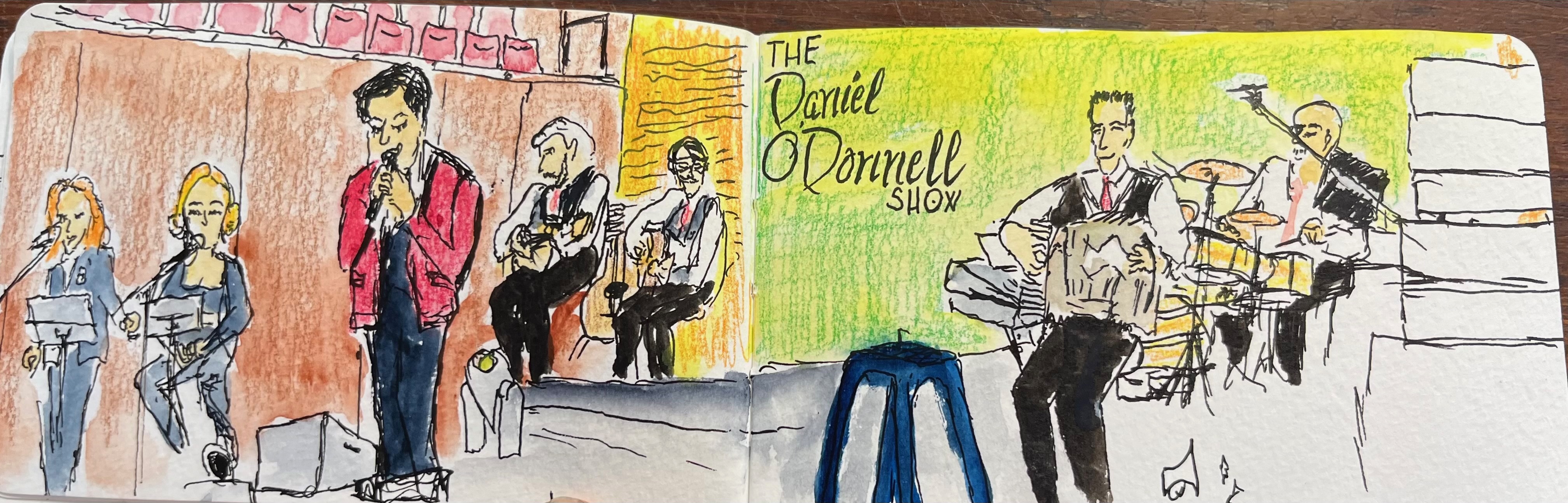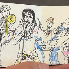 Challenges at Live performances may be small seats, peoples heads in the way, lights going up and down, and moving performers who change clothes and may or may not jump around. I look at the performers body movements and repetitive poses and try to draw one of those. The band and singers are usually in similar positions, but may be obstructed. So I try to capture poses I see and may have to edit the stage size slightly but the viewer may not know this. Sometimes you have to wait for the