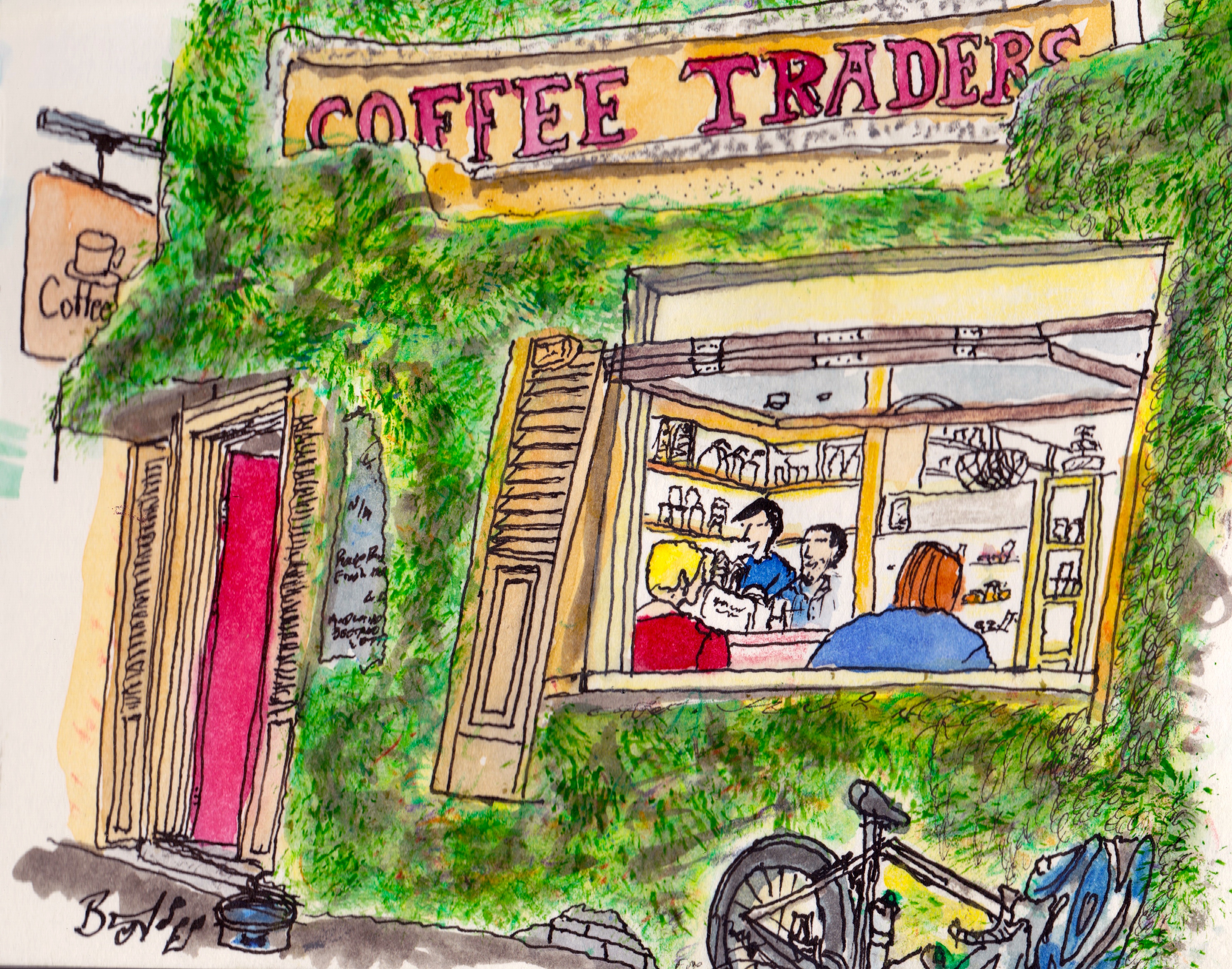 coffee traders Coffee I must remember to scan my signature before publishing. Coffee Traders in Mornington I am experimenting with scanning and pst editing my painting. this one comes up a little brighter/cartoonty Share this: Share on Facebook (Opens in new window) Facebook Like Loading... Related