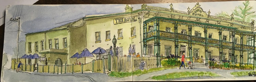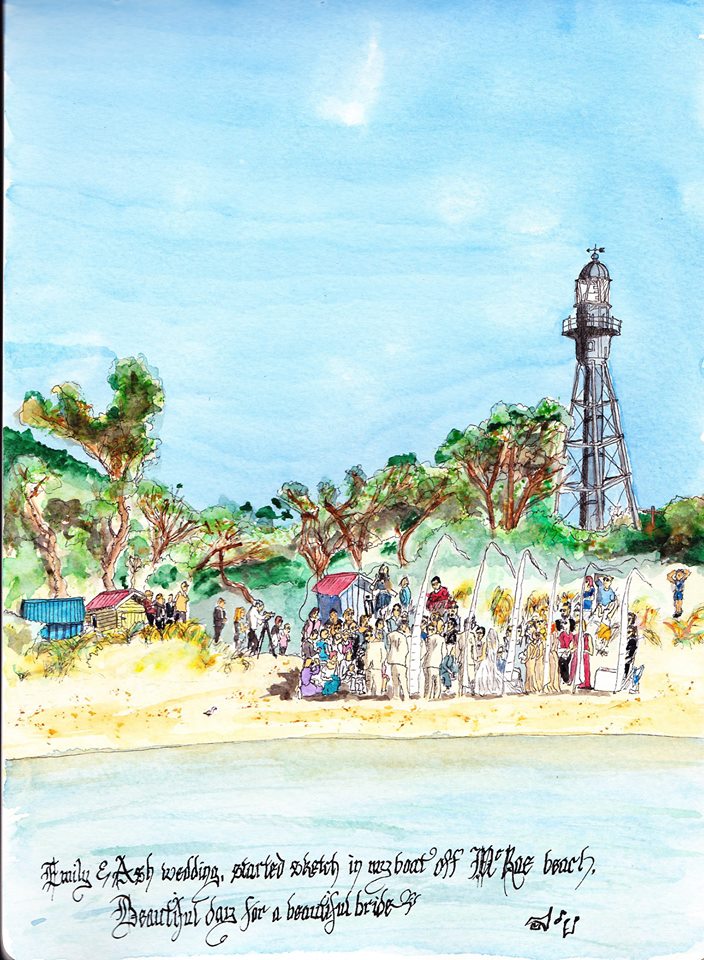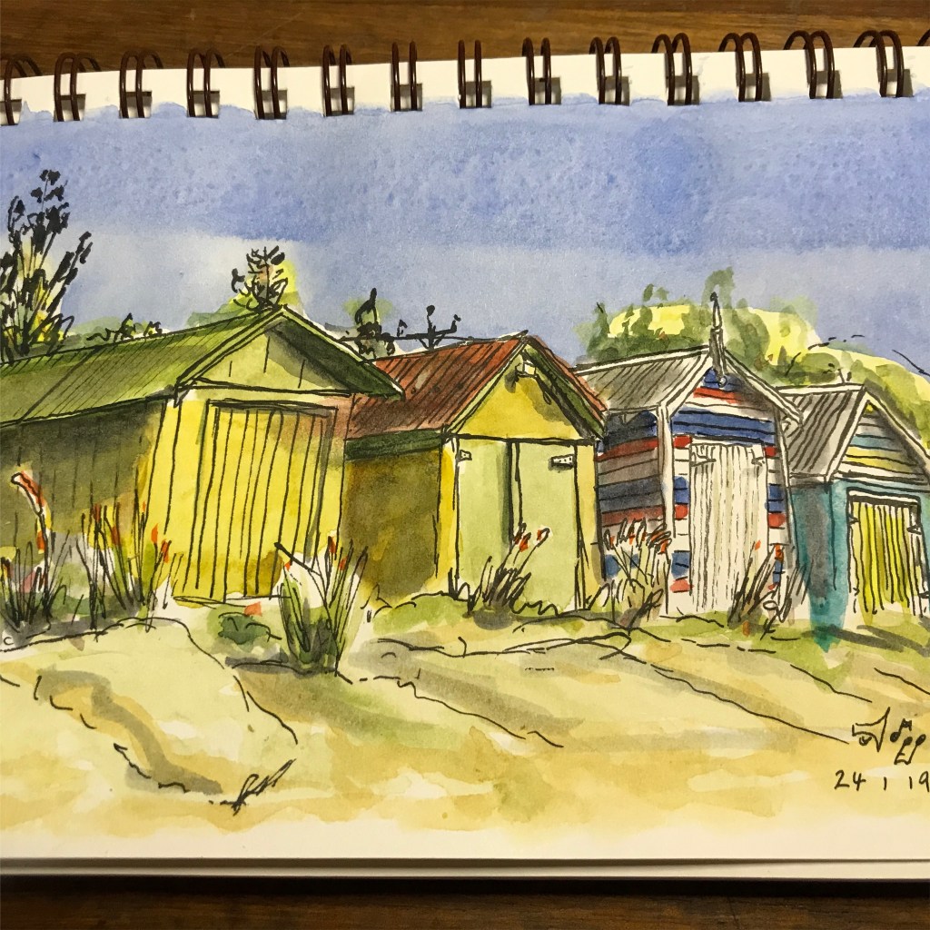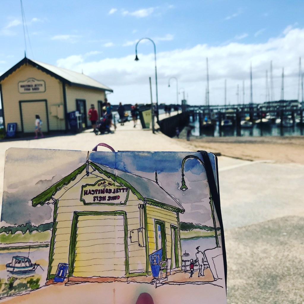 The Mornington Peninsula Just a few from the area, I get to sketch a bit whilst sitting on the beach. St Marks in Dromana, my first Urban sketch drawing! The Royal in Mornington Hastings Pier Ah, the beach boxes The beach the Alley Cafe More beach boxes A regular pose Back Home Share this: Share on Facebook (Opens in new window) Facebook Like Loading...